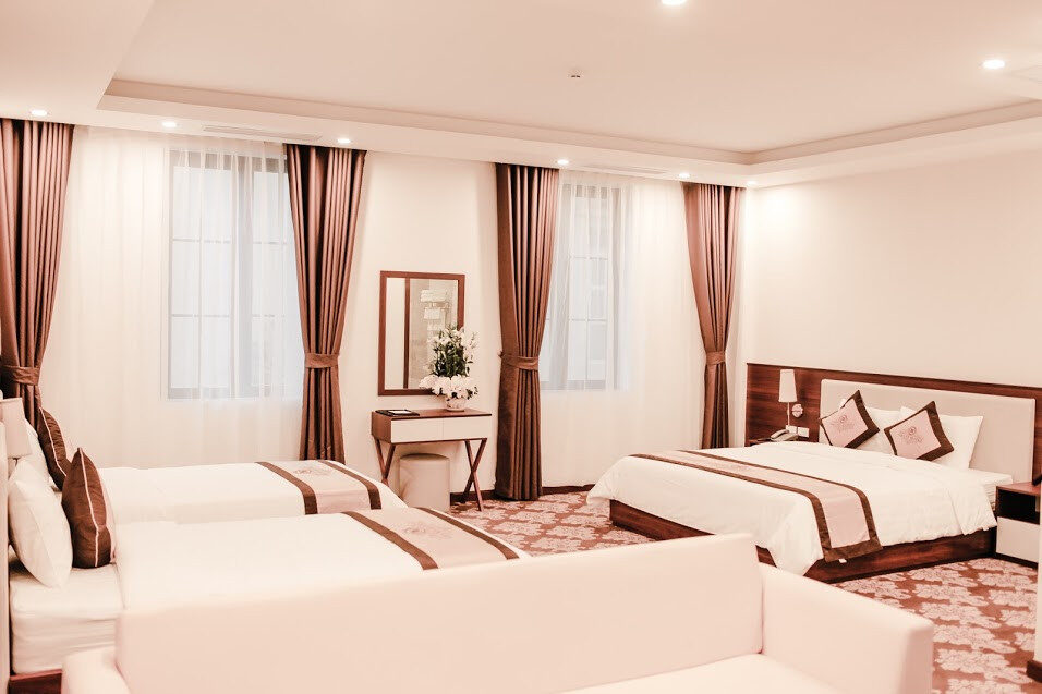 Hạng phòng Deluxe mang đến không gian rộng ấn tượng với phong cách thiết kế độc đáo, sử dụng tông màu trắng sữa và hồng pastel. Phòng có 2 giường đơn và 1 giường đôi, phù hợp nhóm bạn hoặc gia đình từ 4 người.