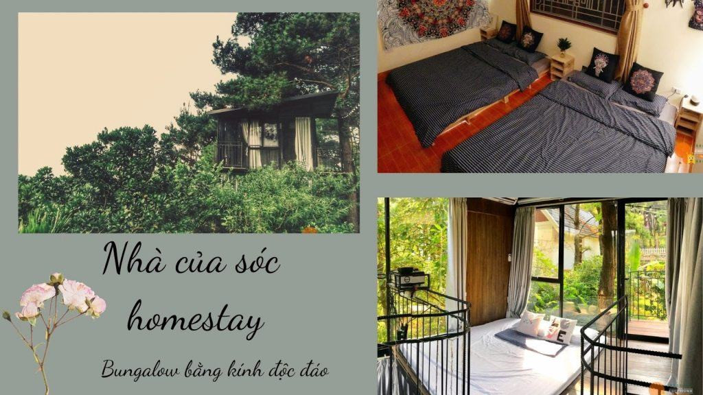 Tọa lạc giữa rừng thông, Nhà Cửa Sóc homestay với kiến trúc vô cùng độc đáo là những căn nhà được bao quanh bởi kính. Chính nhờ thiết kế độc đáo này mà không gian phòng nghỉ được bạn có thể đón nhận và ngắm nhìn trọn vẹn khung cảnh thiên nhiên núi rừng nơi đây.