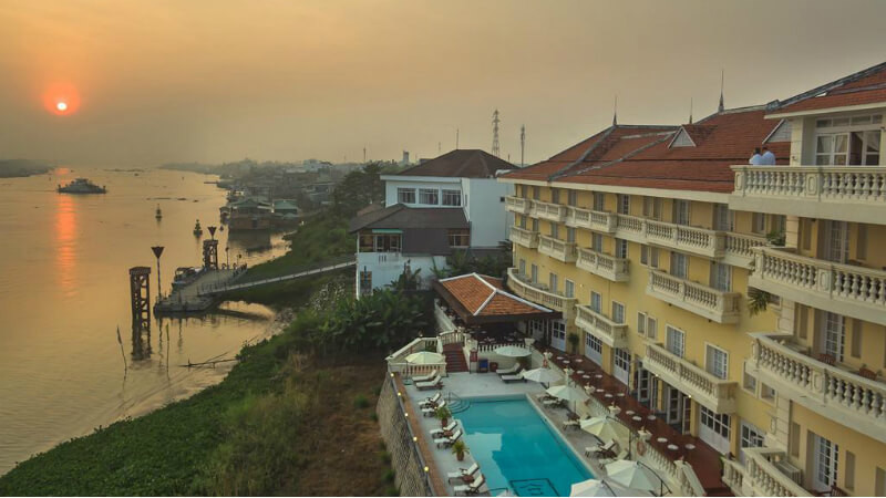 Khách sạn Victoria Châu Đốc được xây dựng theo phong cách cổ điển Pháp, tạo nên một không gian sang trọng và ấm cúng.