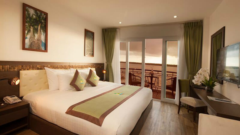 Phòng nghỉ hiện đại, với ban công hướng ra sông Tiền tuyệt đẹp.