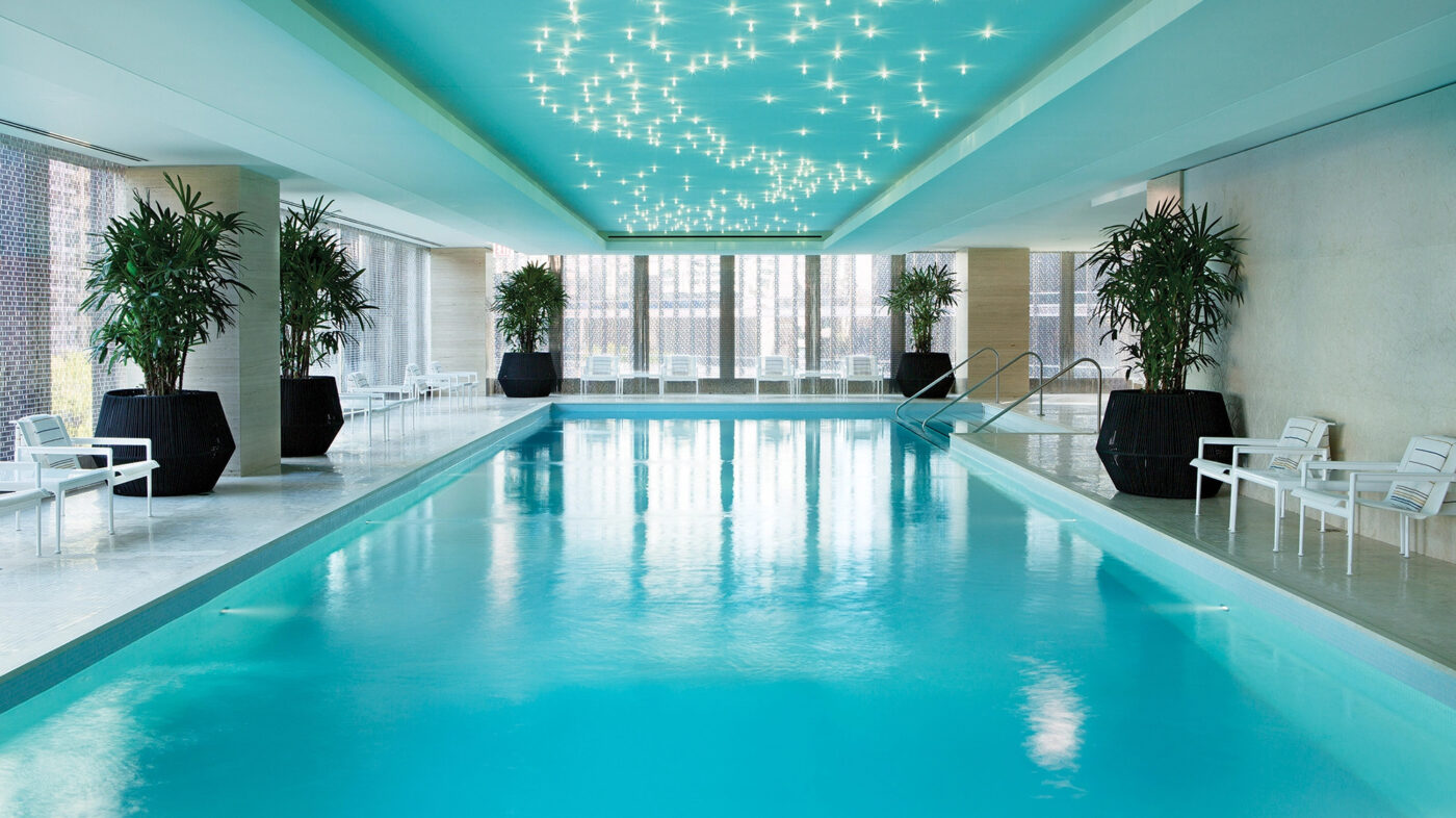 Bể bơi trong nhà có nước trong xanh và hệ thống lọc hiện đại, thích hợp để thư giãn hoặc tổ chức sự kiện nhỏ bên hồ.