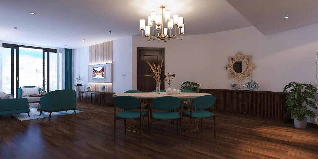 - Bố trí: Không gian tích hợp phòng khách, phòng bếp và 2 phòng ngủ riêng biệt (1 giường đôi, 2 giường đơn).
