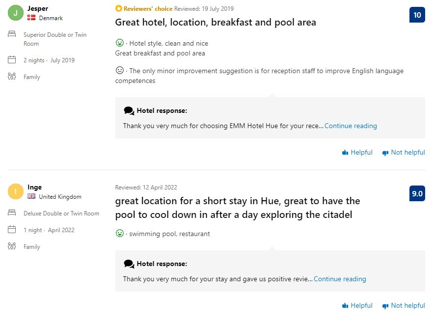 Khách sạn Émm Huế nhận được nhiều đánh giá tích cực từ phía khách hàng nhờ vào dịch vụ tận tâm và chất lượng phòng nghỉ cao cấp. Nhiều du khách cho biết họ rất hài lòng về không gian thoải mái và sự hỗ trợ chu đáo từ đội ngũ nhân viên.