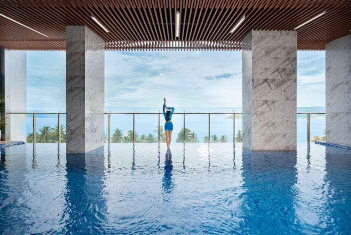 Ngoài tiện nghi phòng ngủ, Vinpearl còn cung cấp nhà hàng sang trọng, quầy bar bể bơi, và khu spa chăm sóc sức khỏe.