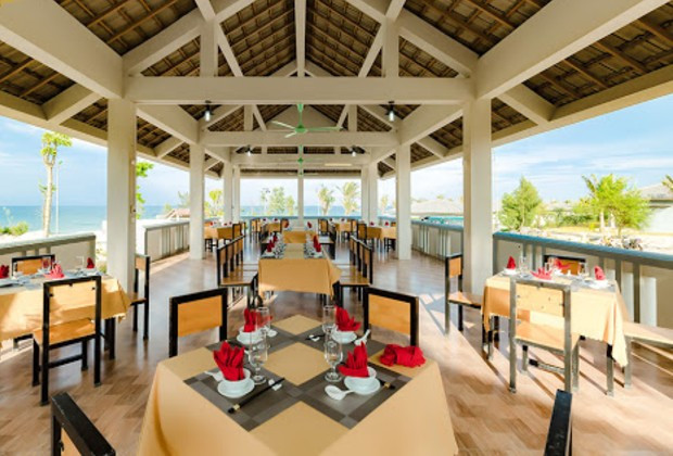 Ngoài hồ bơi rộng lớn, nhà hàng tại resort phục vụ các món hải sản tươi ngon sẽ khiến du khách thích thú mỗi khi đặt chân đến đây.