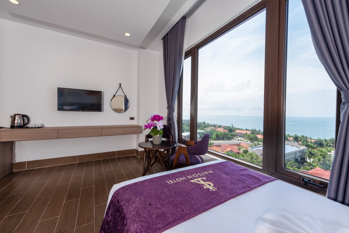 Cảm giác thư giãn tuyệt đối từ phòng ngủ hướng biển tại Maison Hotel.