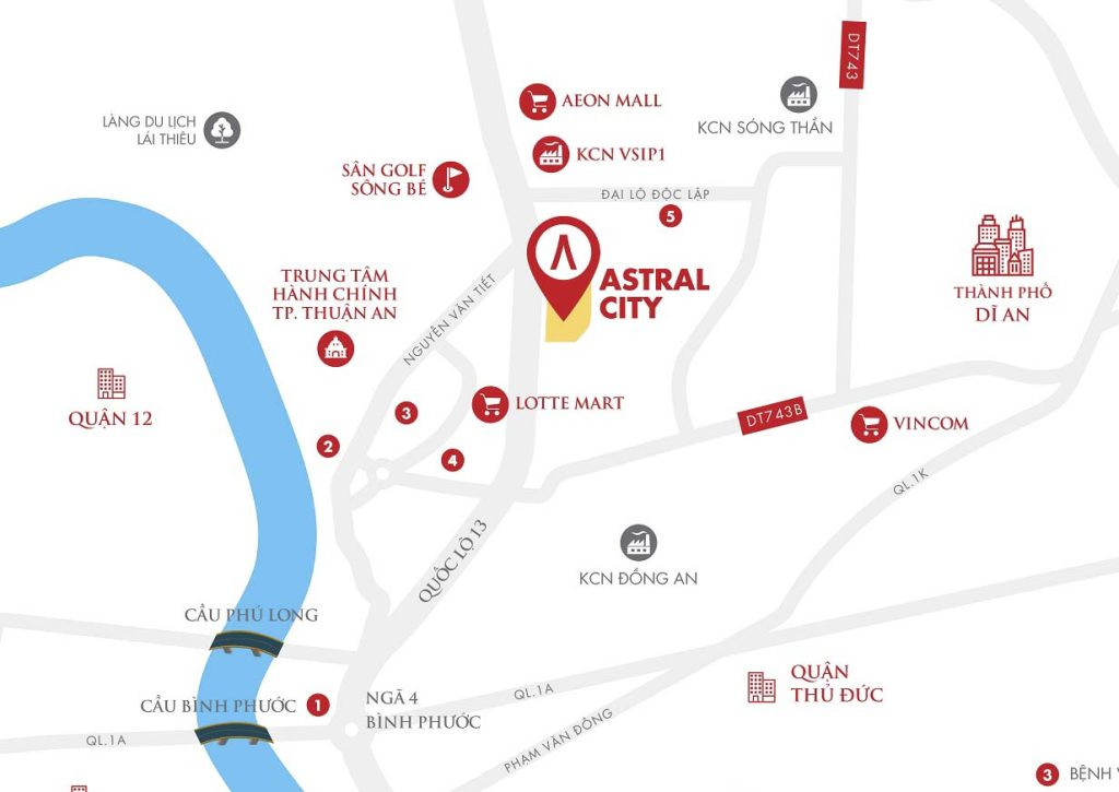 Astral City Bình Dương nằm ngay mặt tiền Quốc lộ 13, kết nối thuận tiện với bốn thành phố lớn, bao gồm TPHCM, Dĩ An, Thủ Dầu Một, và TP Thủ Đức. Từ đây, cư dân có thể dễ dàng tiếp cận các điểm đến quan trọng mà không phải di chuyển quá xa.