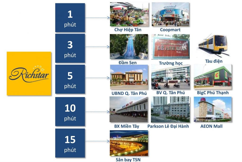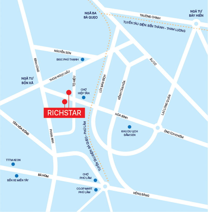 Richstar Tân Phú tọa lạc tại vị trí đắt giá, dễ dàng kết nối với các khu vực xung quanh. Dự án cách UBND quận Tân Phú chỉ 3 phút, gần nhiều tiện ích như siêu thị, bệnh viện và trung tâm thương mại lớn.