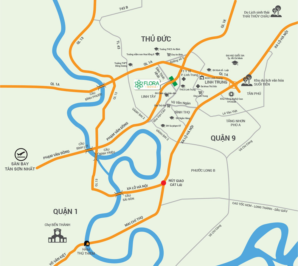 Vị trí địa lý luôn đóng vai trò quyết định trong các quyết định đầu tư bất động sản. Dự án chung cư Flora Novia sở hữu vị trí chiến lược ngay ngã tư Phạm Văn Đồng và Đào Trinh Nhất, nối liền khu vực phía Đông và Bắc của TP.HCM. Dưới đây là một số kết nối nổi bật mà cư dân tại đây sẽ được hưởng lợi: