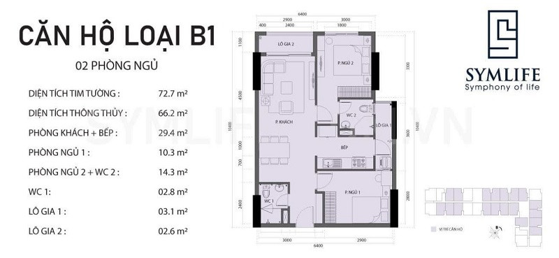 Layout căn hộ 2 phòng ngủ – Loại B1