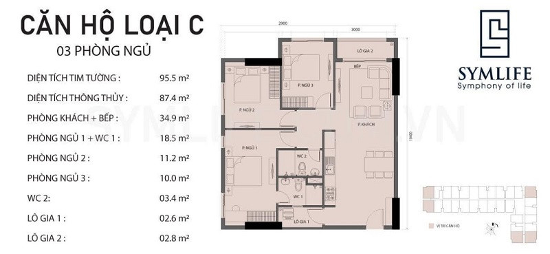 | Căn hộ 3PN | 91.3 – 95.3m² | từ 2.9 tỷ/căn |