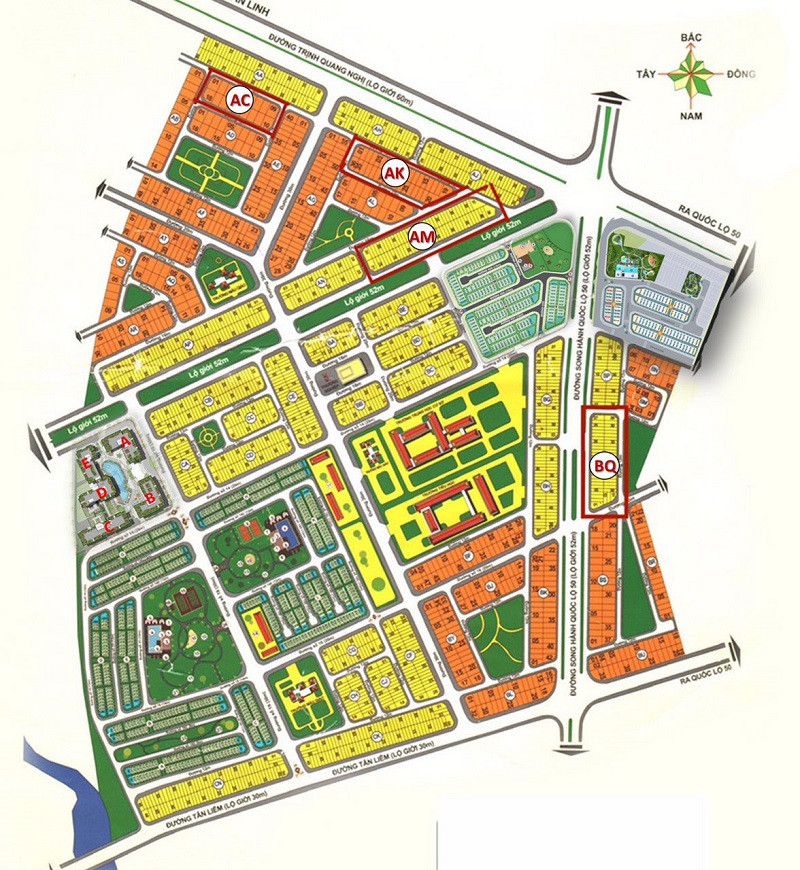 - Khu A: 196.953m², gồm 759 căn nhà liên kế vườn, 1 trường mầm non và 3 công viên giải trí.
