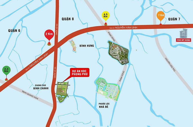 Khu dân cư nằm gần các tuyến đường giao thông quan trọng như Quốc lộ 50 và Nguyễn Văn Linh. Lợi thế về vị trí giúp cư dân dễ dàng di chuyển, tiết kiệm thời gian.