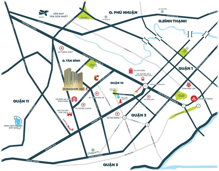 Vị trí là yếu tố quan trọng nhất trong bất động sản. Dự án Kingdom 101 nằm tại số 334, đường Tô Hiến Thành, với vị trí chiến lược giúp cư dân dễ dàng di chuyển đến các quận lân cận như Quận 1, Tân Bình, và nhiều khu vực trung tâm khác. Về phía Bắc, dự án giáp trường THCS Nguyễn Văn Tố, phía Nam tiếp giáp với đường Tô Hiến Thành, mở ra nhiều cơ hội kết nối giao thông thuận lợi cho cư dân.