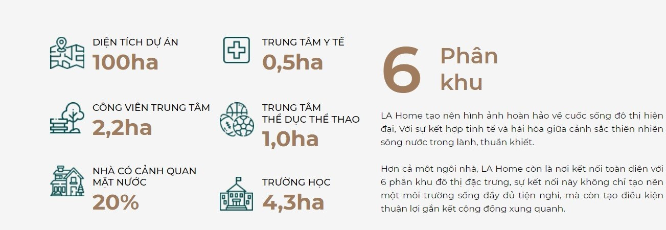 LA Home được xây dựng trên diện tích lên đến 100ha, được chia thành 6 phân khu chức năng rõ ràng, mỗi phân khu đều có những đặc điểm và tiện ích riêng biệt. Dưới đây là một số tiện ích nổi bật của dự án: