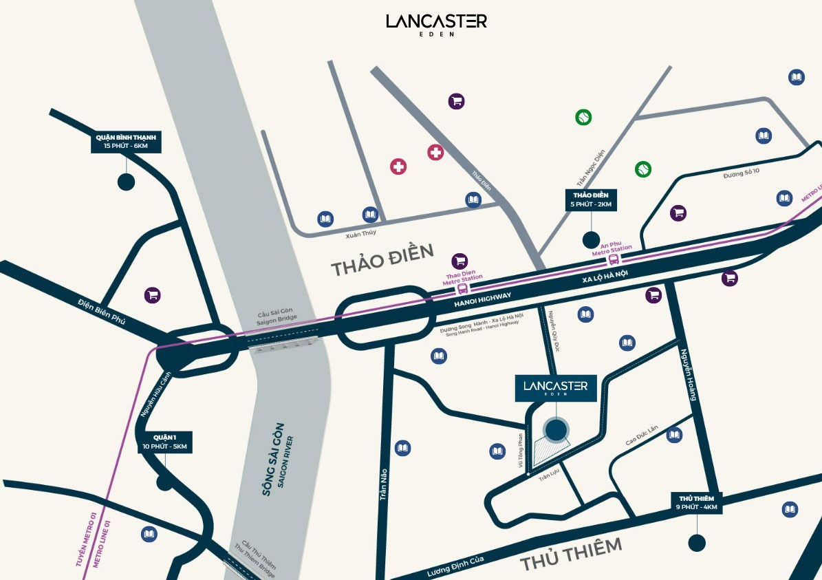 Lancaster Eden không chỉ thỏa mãn nhu cầu sống của cư dân mà còn gần gũi với hệ thống tiện ích ngoại khu phong phú như trung tâm thương mại lớn, bệnh viện, trường học quốc tế và ga tàu điện Metro.