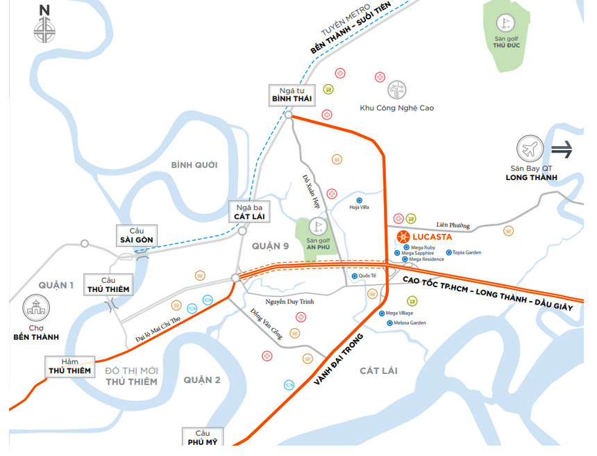 Dự án nằm gần các trục đường lớn như hầm Thủ Thiêm và cầu Sài Gòn, cùng với hệ thống giao thông hiện đại. Lucasta Villa không chỉ thuận lợi cho việc di chuyển mà còn mang lại cảm giác tách biệt hoàn hảo với sự ồn ào của đô thị, hứa hẹn một không gian sống lý tưởng.