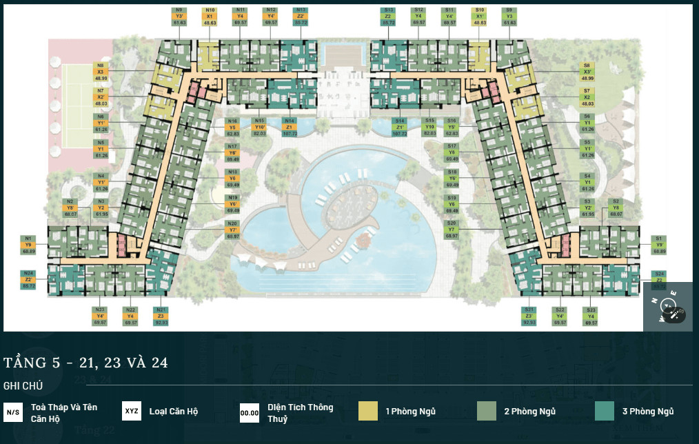 | 1 phòng ngủ | 48.03 – 55.58 | 2.3 – 2.8 |