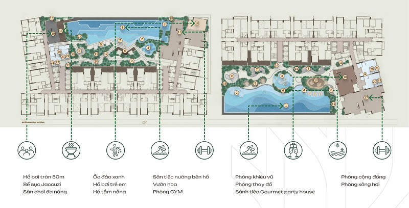 - Tiện Ích Đa Dạng: Hồ bơi, gym, khu vui chơi cho trẻ em và nhiều dịch vụ khác.