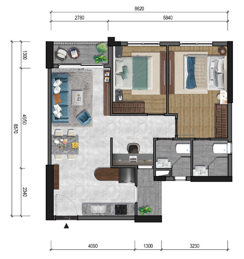 Layout căn hộ 2 phòng ngủ
