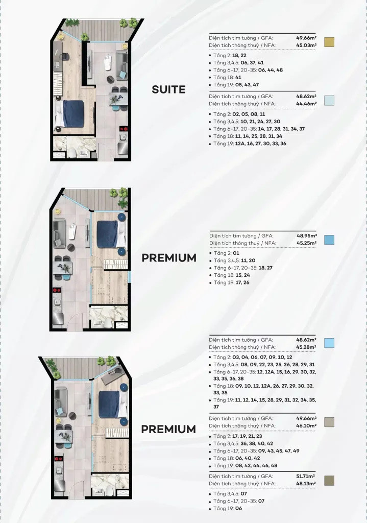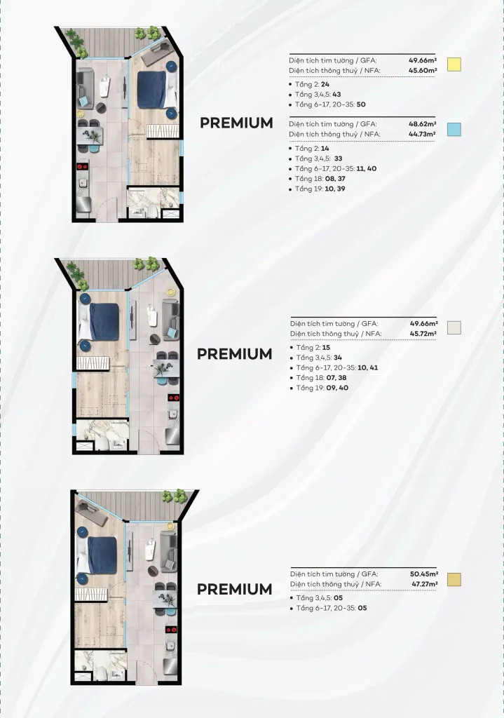 | 1 Phòng ngủ | 45 – 53 | 2,1 – 2,6 |