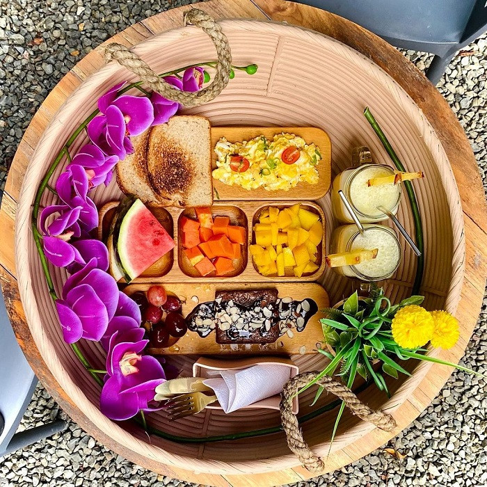 Du khách sẽ có cơ hội thưởng thức bữa sáng ngon miệng ngay tại phòng hoặc khu vực hồ bơi. Các món ăn được chế biến từ nguyên liệu địa phương tươi ngon, không chỉ để thỏa mãn vị giác mà còn tạo nên những bức hình sống ảo thú vị khi thức ăn được đặt trên khay nổi trong hồ bơi.