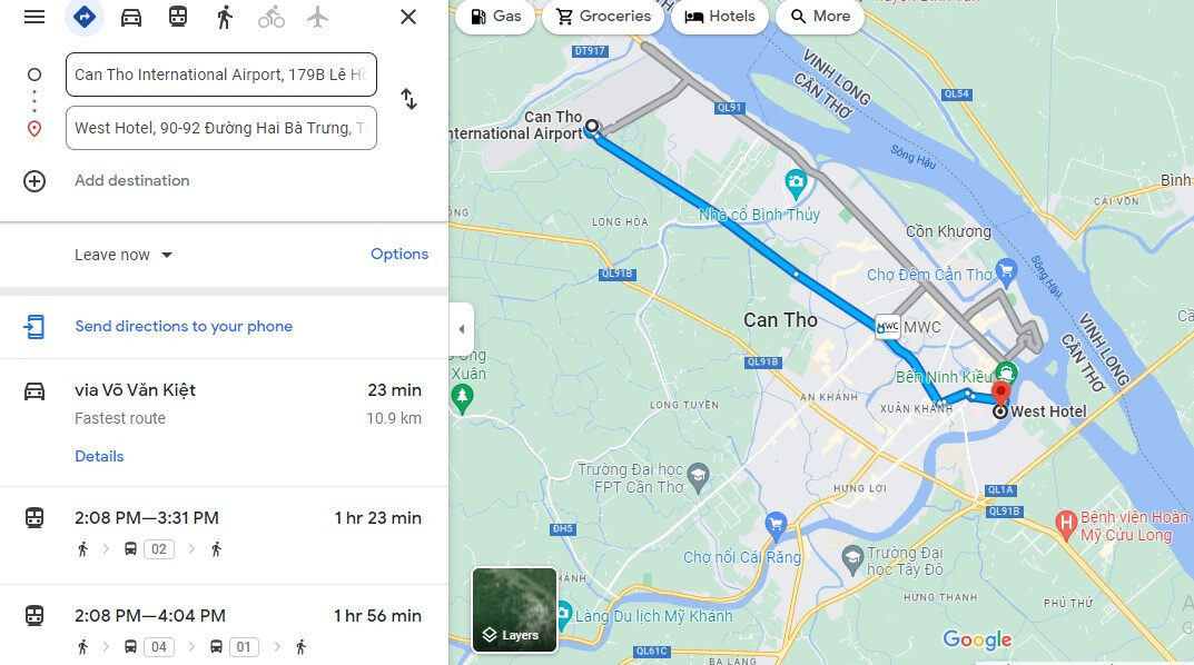 - Từ miền Bắc/miền Trung: Máy bay là phương tiện nhanh nhất để đến Cần Thơ, đáp tại sân bay quốc tế Cần Thơ. Từ đây, bạn có thể thuê taxi hoặc sử dụng dịch vụ đưa đón tận nơi của khách sạn.